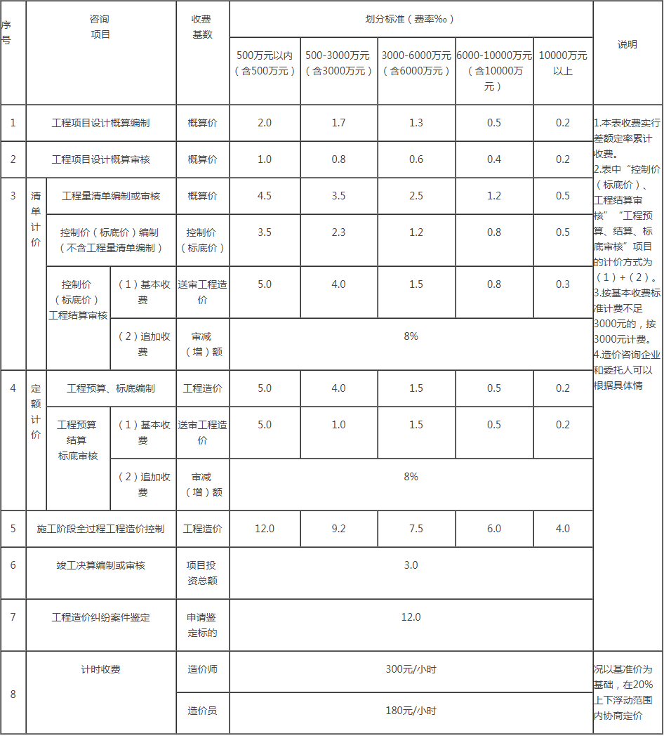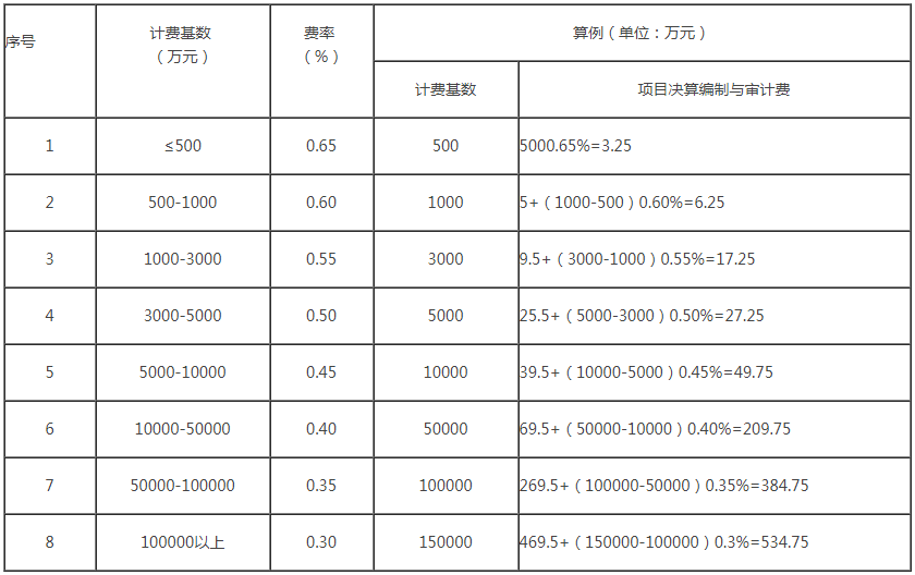 以工程施工費與設備購置費之和最為計費基數(shù),采用差額定率累進法計算。