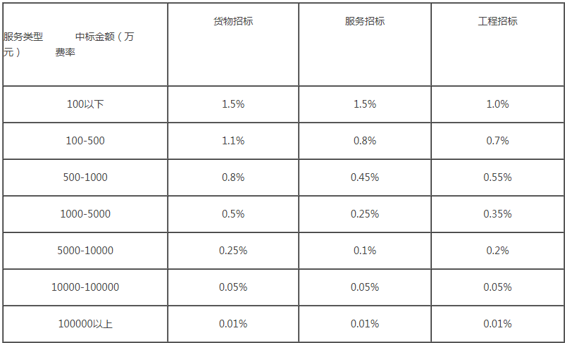 根據(jù)國家計委計價[2002]1980號文,工程招標代理服務收費以中標金額為基礎(chǔ)按差額定率分檔累進法計算,具體見下表: