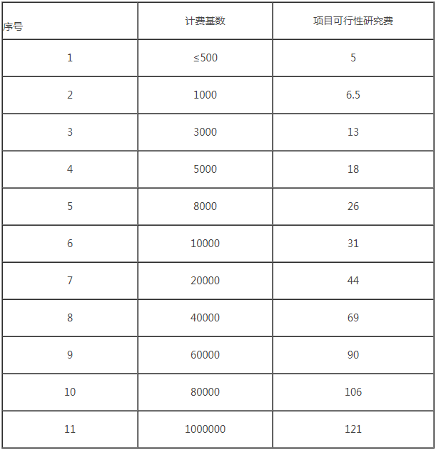 1、項目可行性研究費以工程施工費與設備購置費之和作為計費基數(shù),釆用分檔定額計費方式計算,各區(qū)間按內(nèi)插法確定。項目可行性研究費計費標準