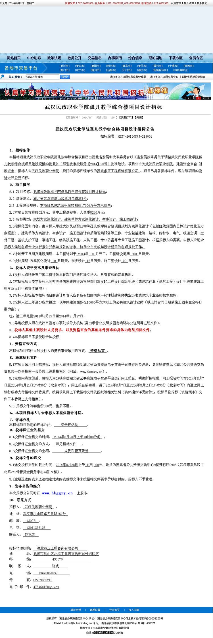 武漢民政職業學院孤兒教學綜合樓項目設計招標