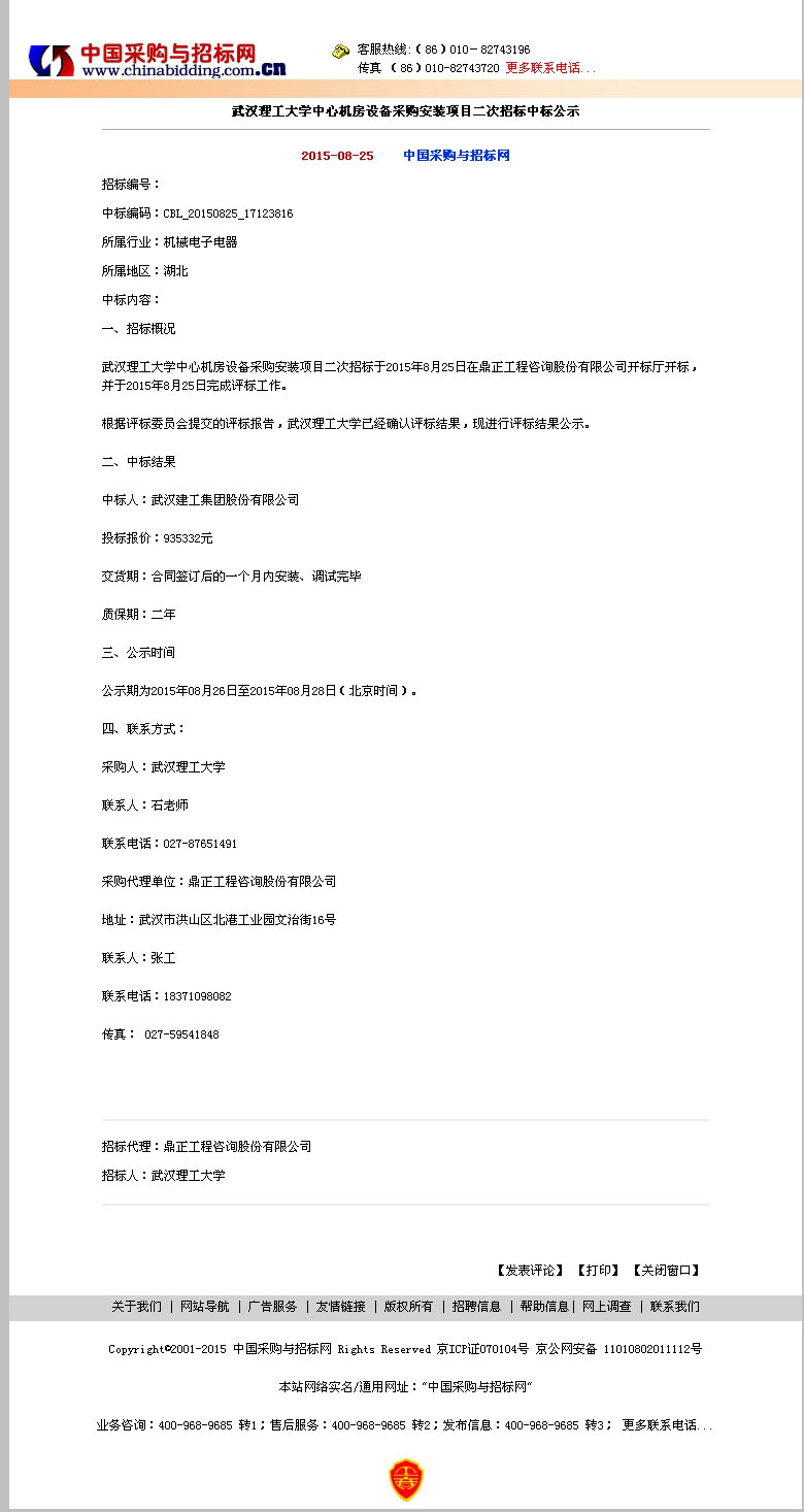 武漢理工大學中心機房設備采購安裝項目二次招標中標公示