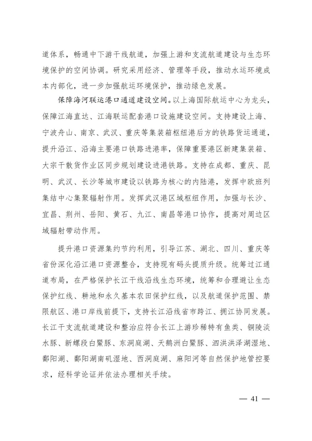 以上海國際航運中心為龍頭,保障江海直達、江海聯運配套港口設施建設空間。支持建設上海、寧波舟山、南京、武漢、重慶等集裝箱樞紐港后方的鐵路貨運通道,提升沿江、沿海主要港口鐵路進港率,保障重要港區新建集裝箱、大宗干散貨作業區同步規劃建設進港鐵路。