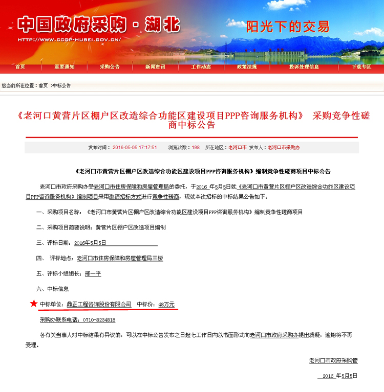 【經營成果】我司中標老河口市黃營片區棚戶區改造綜合功能區建設項目PPP咨詢服務機構編制競爭性磋商項目